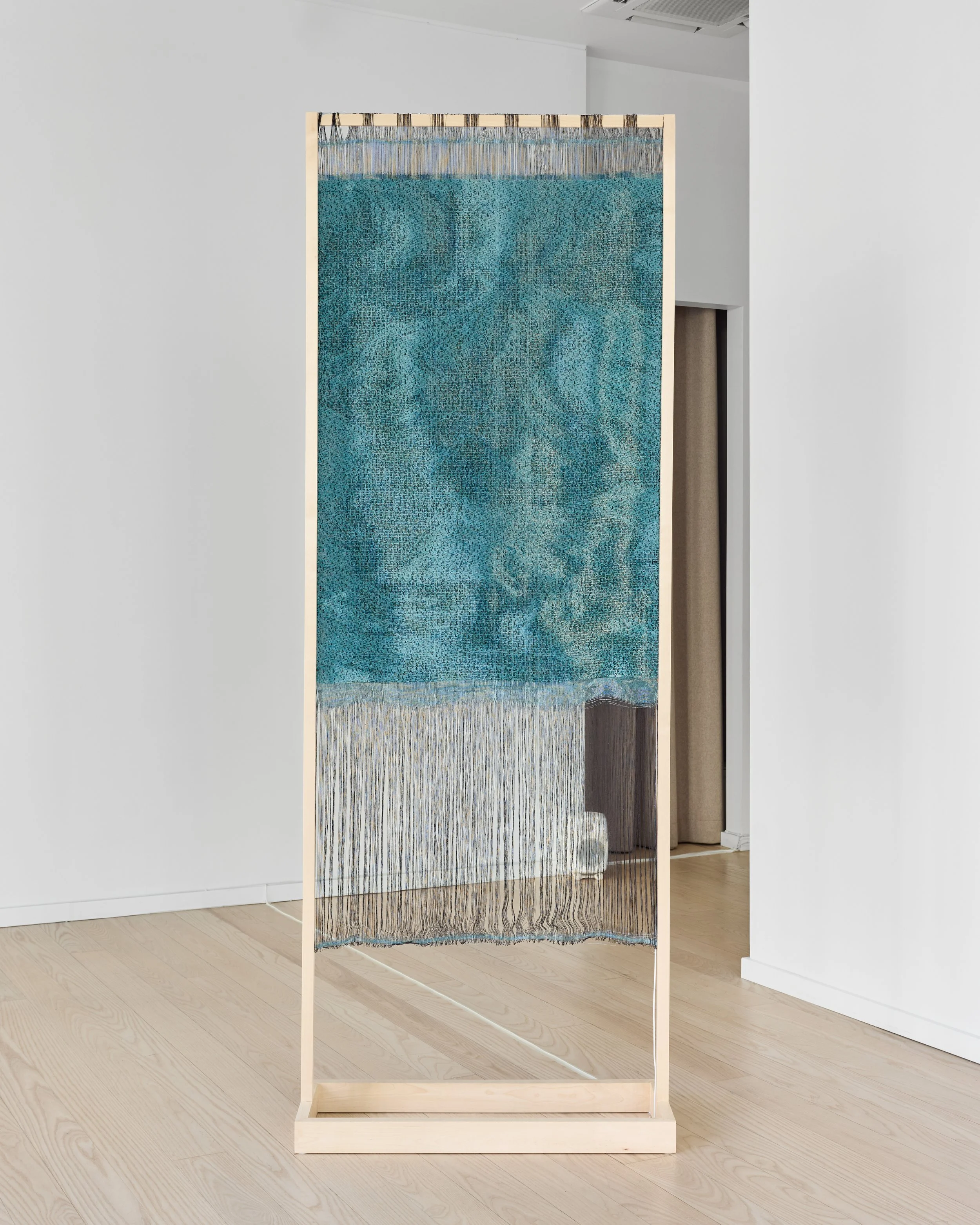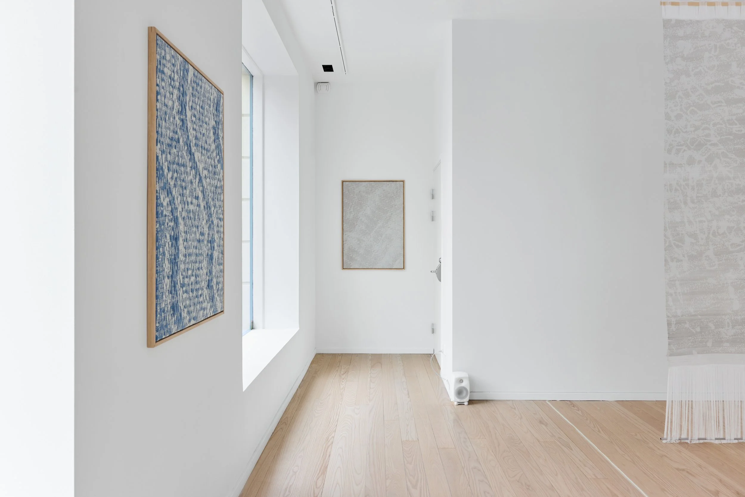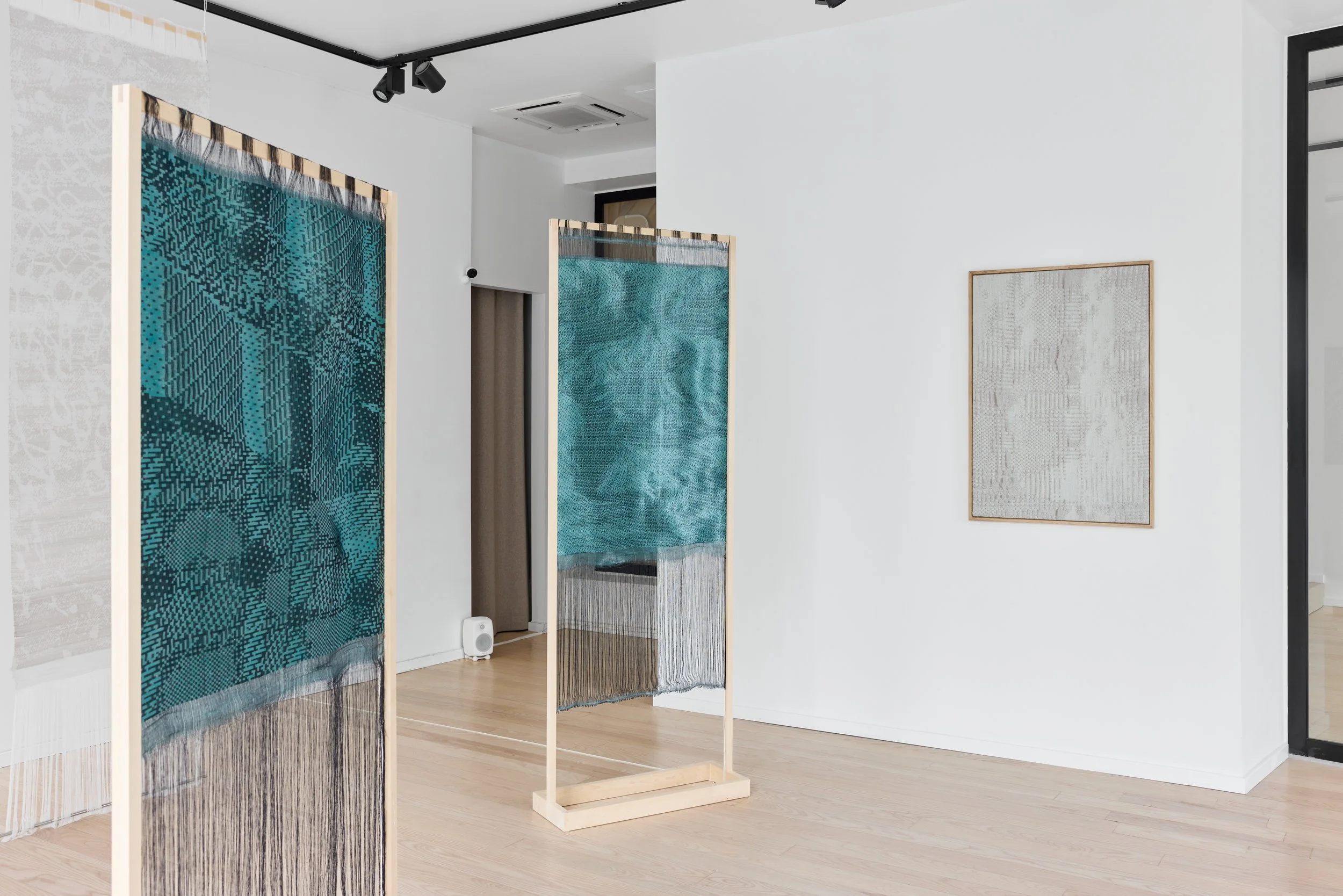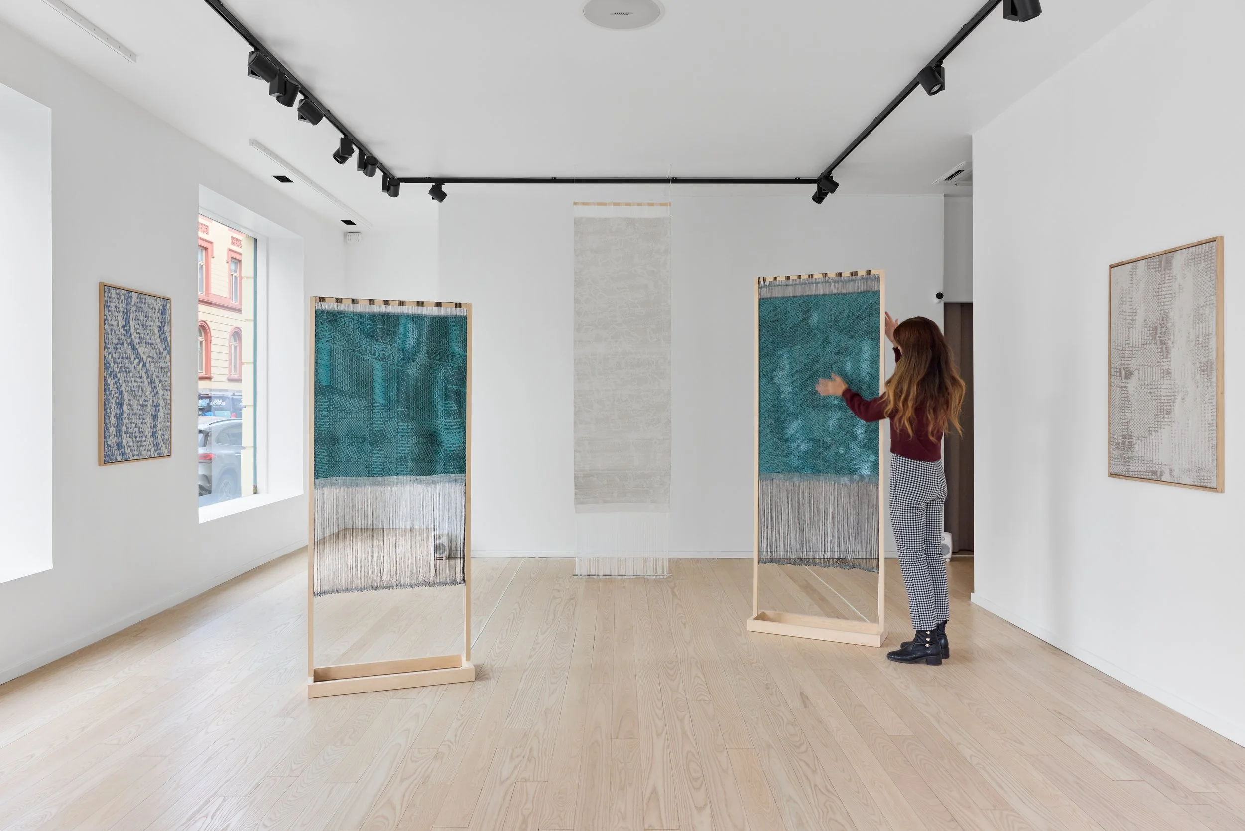 The exhibition features a series of interactive sound textiles and sculptural installations, alongside a collection of silent wall pieces that transform the ephemeral nature of sound into visual and tactile form. Through a meticulous process of translation, musical compositions are rendered as binary image files and reinterpreted into handwoven textiles using a digital loom. Here, sound becomes something physical – something one can touch, walk around, and experience through spatial proximity.